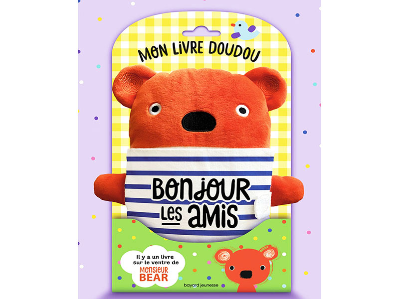 Monsieur Bear est un ours doudou orange aux petites oreilles rondes. Sur son ventre, un petit livre en tissu : un imagier en bichromie pour les premiers mots du quotidien (le matin, la route, les mais, le sommeil).