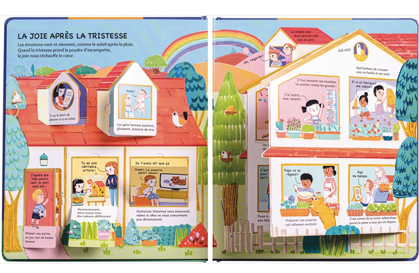 « Mes émotions » s’adresse aux plus jeunes, dès 4 ans, dans un format carré où chaque grande double page présente une émotion (la colère, les soucis, la joie…) avec une multitude de personnages.