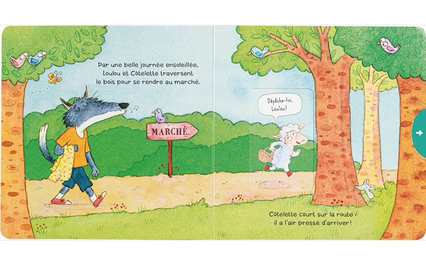 Ce petit livre carré cartonné raconte la visite sur le marché du petit mouton Côtelette.
