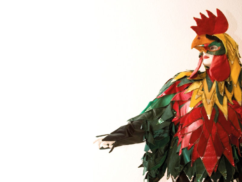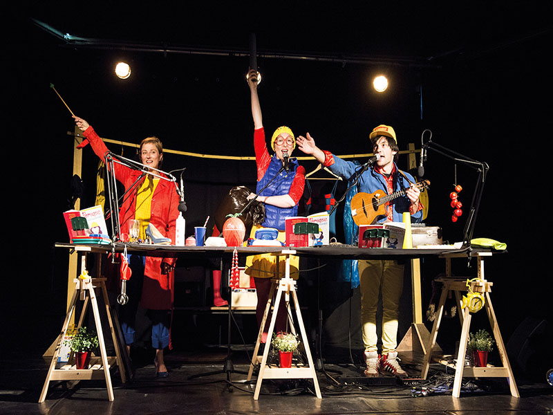 Une grande table remplie de bric-à-brac. Une penderie pleine de vêtements colorés. Et trois artistes sur scène :